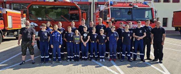 Am 01.06.2024 besuchten wir die Bundeswehrfeuerwehr auf dem Truppenübungsplatz Jägerbrück. Begrüßt wurden wir durch die Kameraden Uwe Henning und Thomas Kunick. Die Fahrzeugtechnik auf der Feuerwache unterscheidet sich schon sehr von der unsrigen. Neben der Fahrzeugtechnik besichtigten wir auch die Werkstätten einschließlich der Schlauchpflegeanlage. Nach dem Gruppenfoto wurden Lian und Hannes ihre Jugendfeuerwehr- Ausweise überreicht.