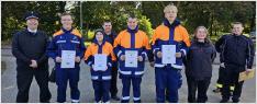 Top 5: Matthies, Pascal und Tamino berichteten über das soziale Projekt im Rahmen der Jugendflamme- Stufe 3 und über die Abnahme des feuerwehrtechnischen Teils der Flamme 3 durch Mirko Borgwardt.