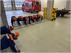 Kaum angekommen, begann es Dauerhaft zu regnen. Wir beschlossen dann unseren Dienst in die Fahrzeughalle zu verlegen. Dort übten wir Knoten, Stiche und Bunde der Feuerwehr und arbeiteten mit den pneumatischen Rettungsgeräten der Feuerwehr.